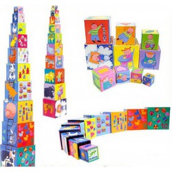 10 cubi in cartone spesso da incastrare, sovrapporre e far cadere quanto si vuole! I bambini sovrappongono i cubi in modo che le illustrazioni creino una sequenza logica: