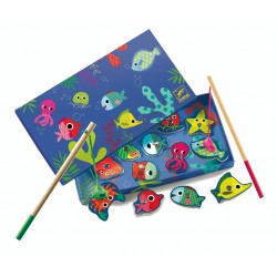 Pronti per una partita di pesca? Ci sono gli animali marini in legno, 2 canne da pesca e una graziosa scatola che si trasforma in fondale marino. La partita di pesca può incominciare! I bambini afferrano i pezzi di legno con la calamita, aiutandosi con la canna.