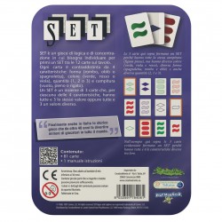 Finalmente anche in Italia lo storico gioco che da oltre 40 anni fa divertire milioni di giocatori in tutto il mondo. SET è un gioco di logica e di concentrazione in cui bisogna individuare per primi un SET tra le 12 carte sul tavolo. Ogni carta è contraddistinta da 4 caratteristiche: forma (rombo, oblò o spagnoletta), colore (verde, rosso o viola), quantità (1, 2 o 3) e campitura (vuoto, pieno o rigato). Un SET è un insieme di 3 carte che, per ciascuna delle 4 caratteristiche, hanno tutte e 3 lo stesso valore oppure tutte e 3 un valore diverso.
