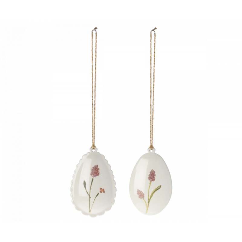 Ornamenti a uovo di Pasqua in metallo con dettagli dipinti a mano, due tipi di bordi. Perfetti su un ramo come decorazione o sulla tavola di Pasqua. Mescolate i diversi colori con altri ornamenti pasquali Maileg per completare la vostra decorazione