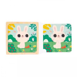 I più piccoli scopriranno il mondo dei puzzle insieme a un piccolo coniglietto bianco! I puzzle in legno sono una grande fonte di apprendimento e soddisfazione per i bambini dai 18 mesi in su: ecco quello adatto a loro! Su questo puzzle per la prima infanzia è raffigurato un adorabile coniglietto goloso immerso nella natura. È composto da 9 pezzi in legno, con una rientranza che facilita la rimozione dei pezzi. Sotto il puzzle è stampato il modello, che aiuterà i più piccoli durante i primi tentativi. Il pratico supporto in legno di questo gioco multisensoriale è ideale per riporre tutti i pezzi e trasportarli ovunque. Questo puzzle permetterà al bambino di sviluppare le abilità fino-motorie, la concentrazione e l'autonomia. È fabbricato in legno FSC®.
